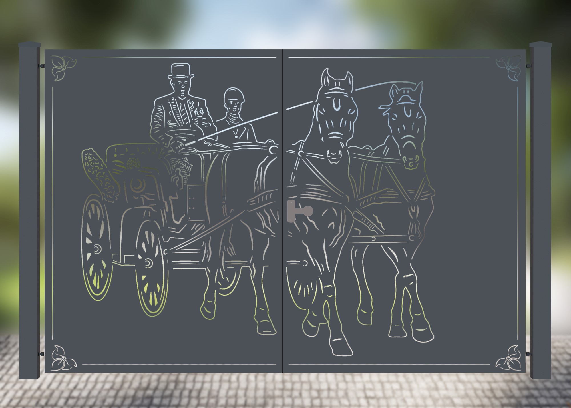 Dekoratives Hoftor als Doppeltor mit Pferdesport-Motiv Kutsche “Hille und Dirk”